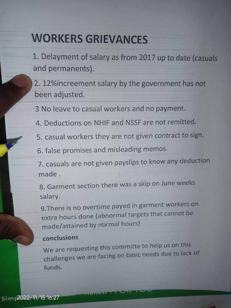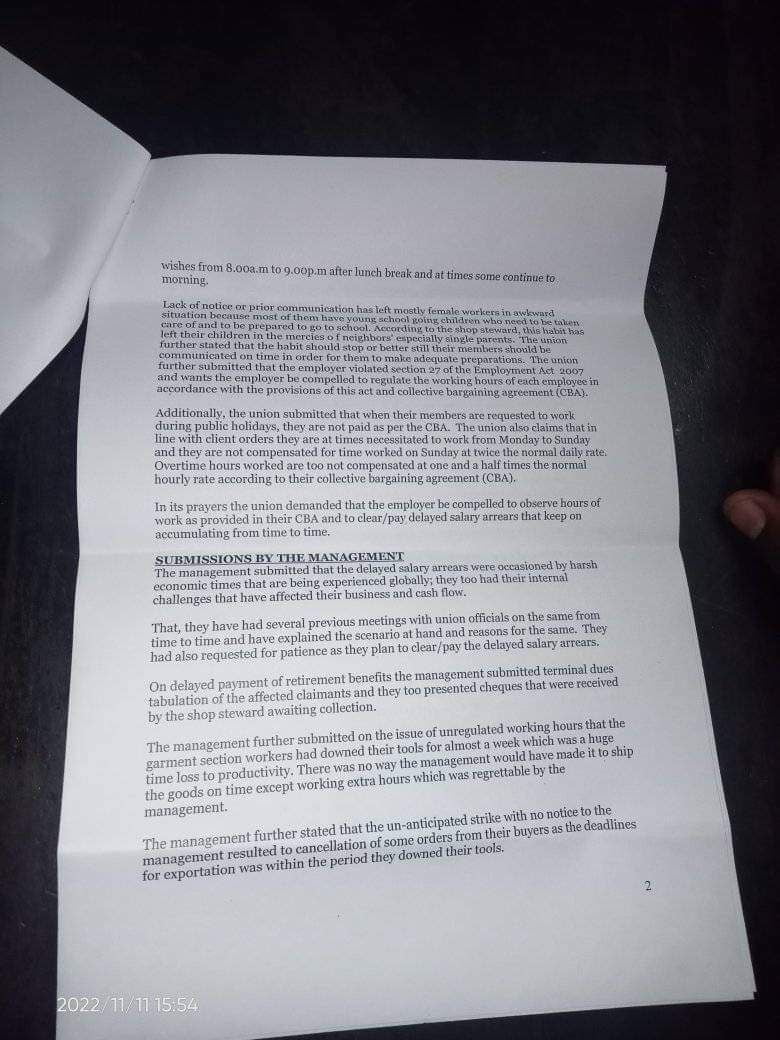 They say that the factory is yet to fully effect the 12 per cent minimum wage increase despite the harsh economic times.