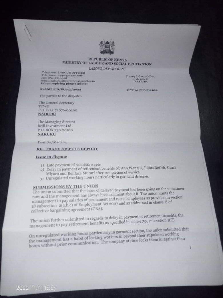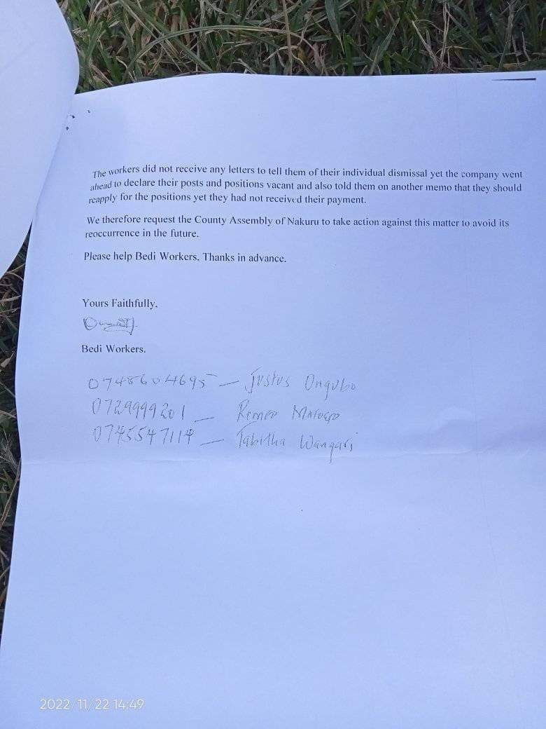 Anasema ako well connected hakuna pahali tungempeleka na ni ukweli juu tulienda kwa governor Kihika 3 weeks consecutive wafanyikazi over 200 but no single day tulipatana na yeye na hadi wa leo hajawai sema kitu,” a source wrote to us on Saturday, December 10, 2022, attaching the documents below.