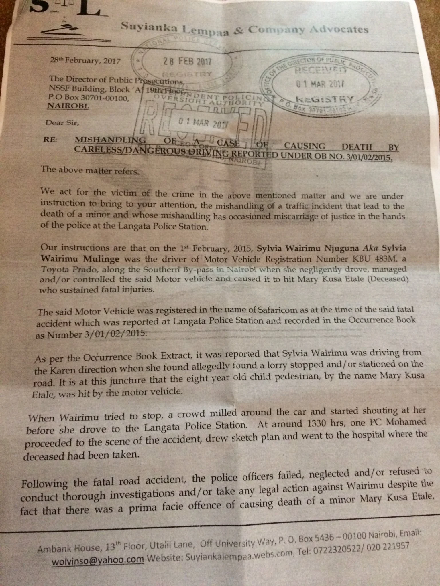 Our Attention has been drawn to a Letter sent to Office of Director Of Public Prosecutions Keriako Tobiko. The Letter that was Received by the Office of the DPP on 1st March 2017 demands for an immediate investigation into the mishandling of a case that Led to the death of minor due to careless driving by Safaricom Consumer Business Unit Director Sylvia Mulinge.