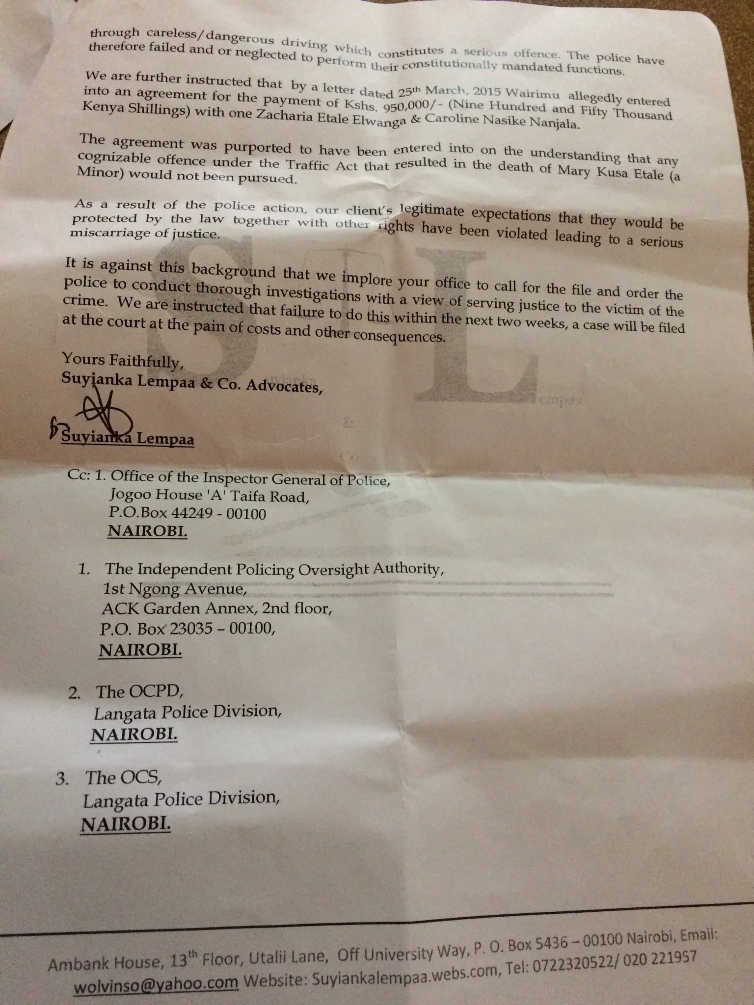The Langata Police Station Officers Failed, neglected and or/refused to conduct thorough investigations and/or take any legal action against Wairimu despite the fact there was a prima a facte offense of causing the death of a minor Mary Kusa Etale- Concludes the Letter to the Office of the Director Of Public Prosecutions