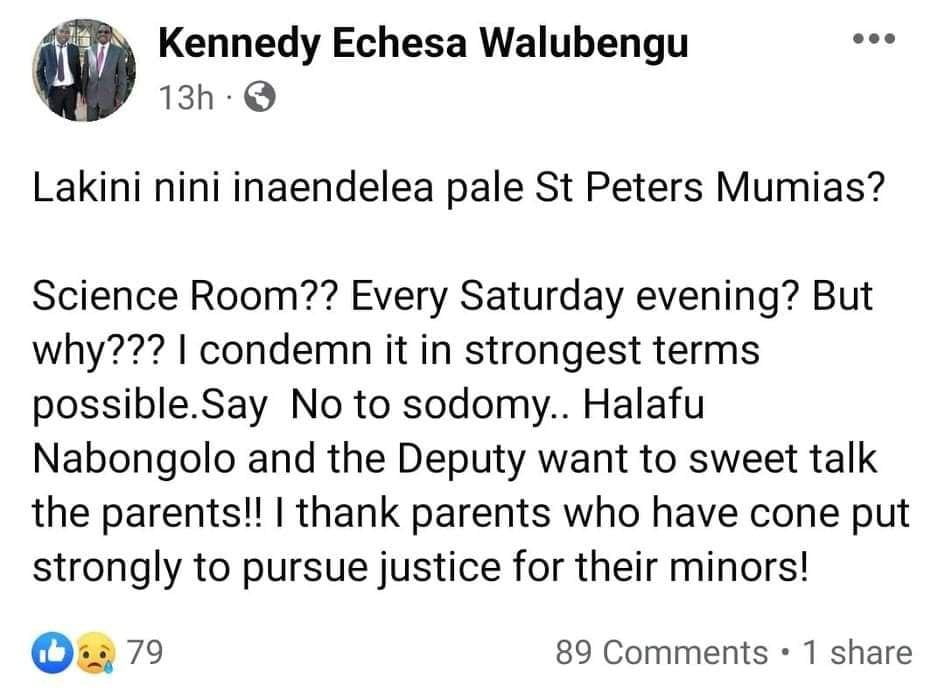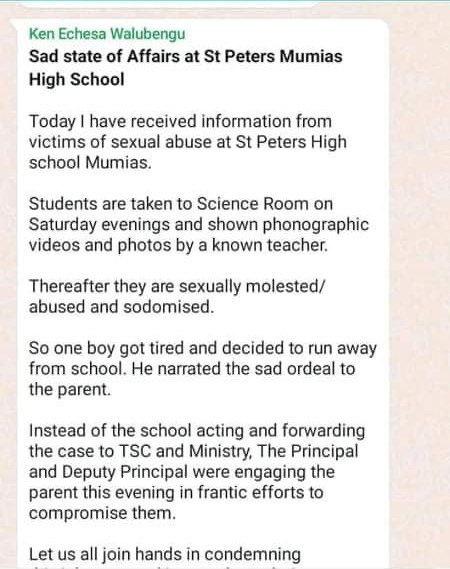 From various posts that circulated on Facebook over the past week, a group of parents with students enrolled at St Peter’s Mumias High School claim that their sons who ran away from school reported having suffered sexual abuse under the hands of the well-known teacher.