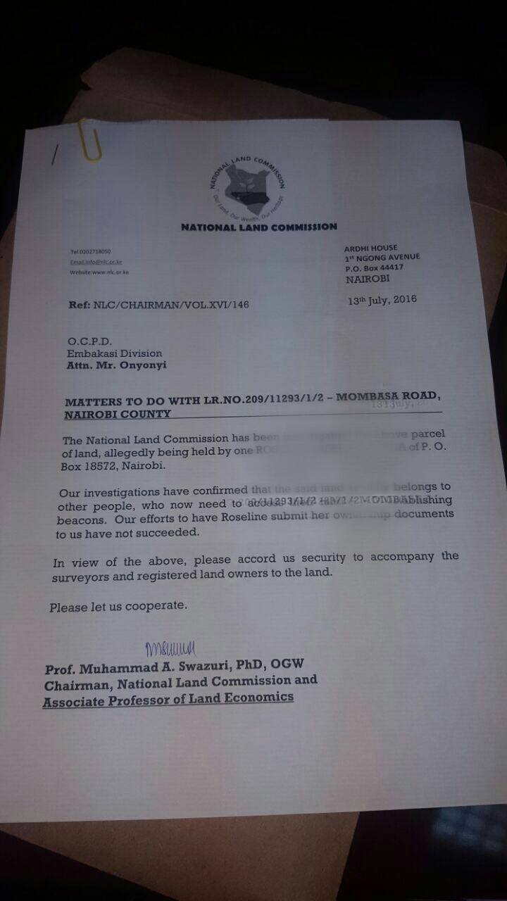 The two known agents of Muhammad Swazuri scouting for land on Mombasa Road are Simon Nyamanya Ondiba and Mary Namanya who together with the Officer Commanding Police Division of Embakasi a Mr. Onyonyi, we're pursuing a parcel of land located on Mombasa Road, LR 209/11293/1/2 which has been owned by one individual for over 25 years.