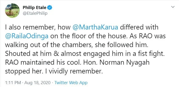 Through a series of tweets on Tuesday afternoon, Etale recounted one incident where Karua and Baba almost engaged in a fistfight at parliament buildings.