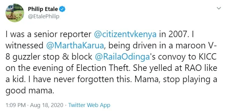 In his other tweet, Etale reminded Karua of her involvement in the malpractices surrounding the controversial 2007 elections in which Raila unfairly lost.