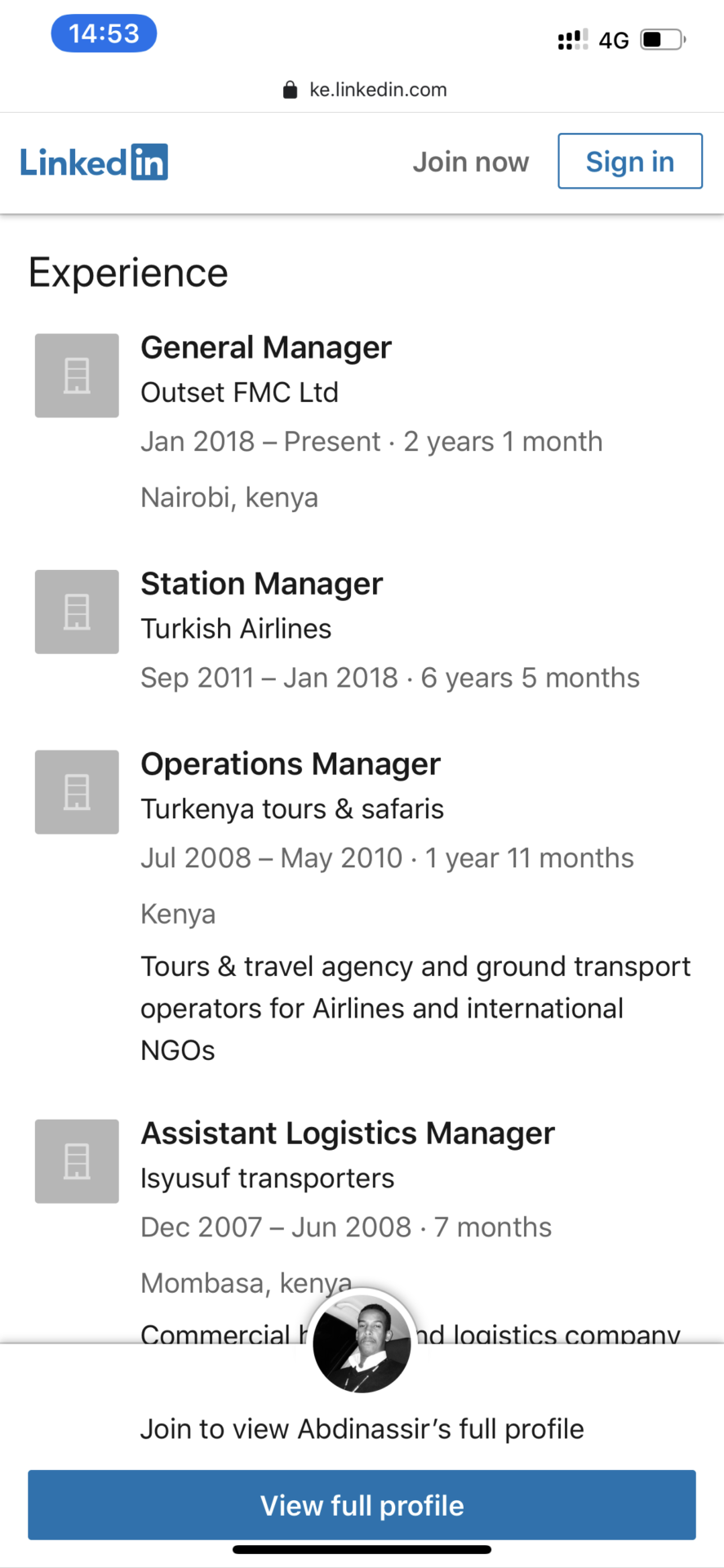 Our source intimated to us that Abdinassir was airport manager Turkish airlines Nairobi sometime back but was fired after the Turkey government demanded a crackdown on Gullen linked employees. He is also linked to a North-Eastern MP who evades taxes and very loud. He was part of the agents that took Turkish to Mogadishu when they started.