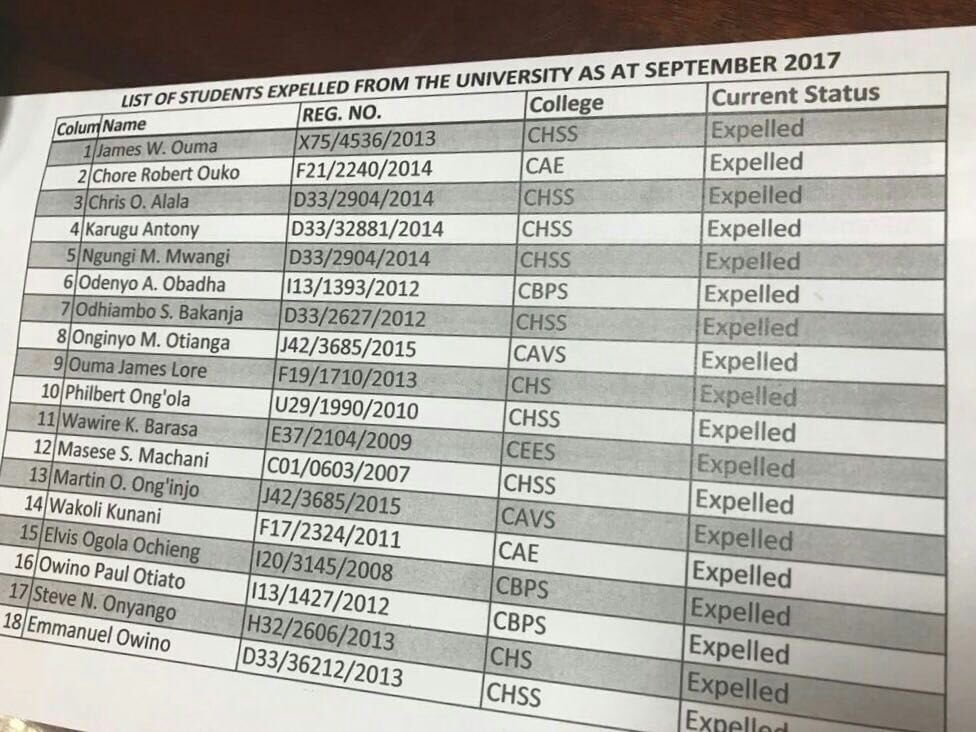 He is a tribalist who has eaten the click bait of ethnicity that demonises members of the Luo community. After the upheavals of 2017, he expelled students for one tribe as the list attached below shows.