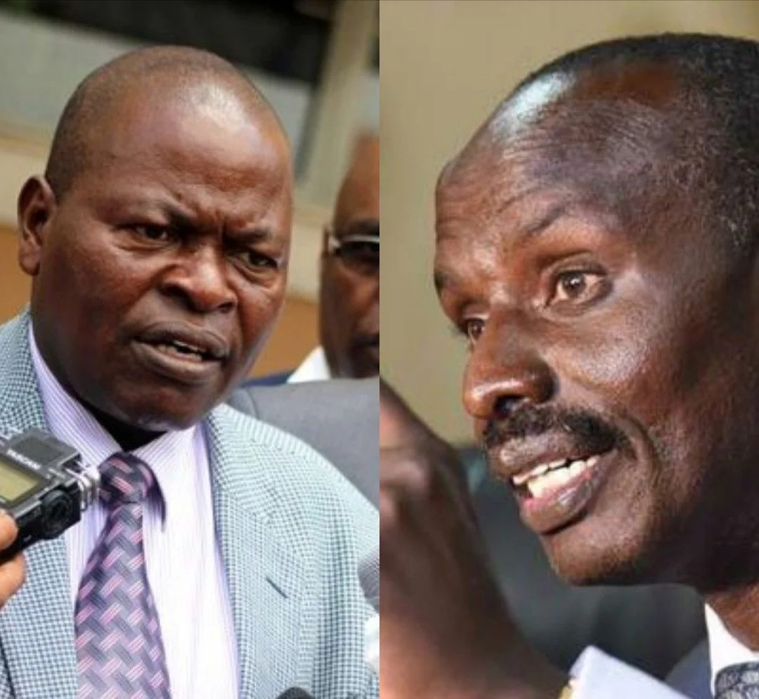 Akello Misori (Left), Secretary General Kenya Union of Post Primary Education Teachers (KUPPET) and Wilson Sossion Kenya National Union of Teachers (KNUT) Secretary General