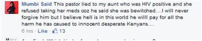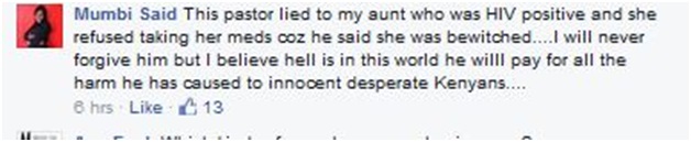 “This pastor lied to my aunt who was HIV positive and she refused taking her medicine because he said she was be-witched. I will never forgive him but I believe hell is in this world. He will pay for all the harm he has caused to innocent desperate Kenyans.” She revealed.