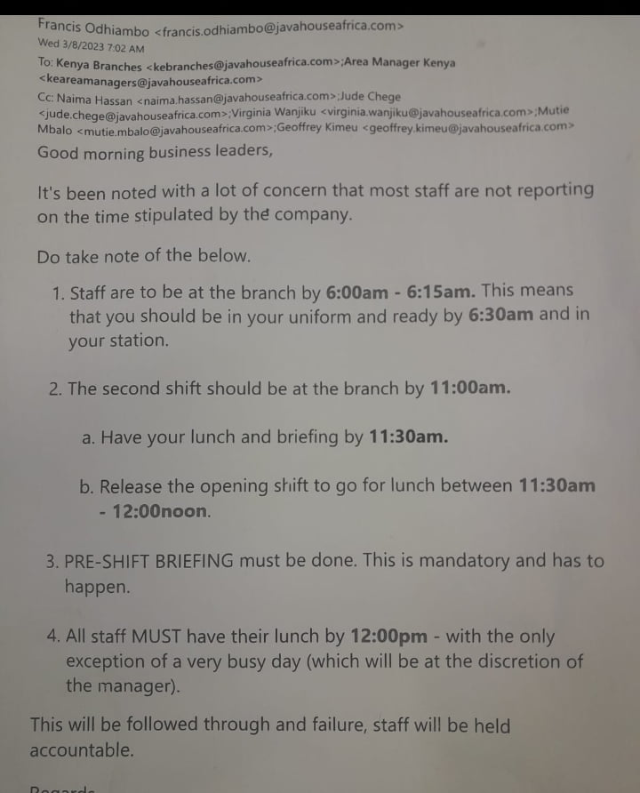 "Remember we are working on holidays, and the above leadership is unable to solve annual leaves, and staff motivation is wanting. These three slay queens are killing Java House Restaurant," the source added, attaching the memo shared below.