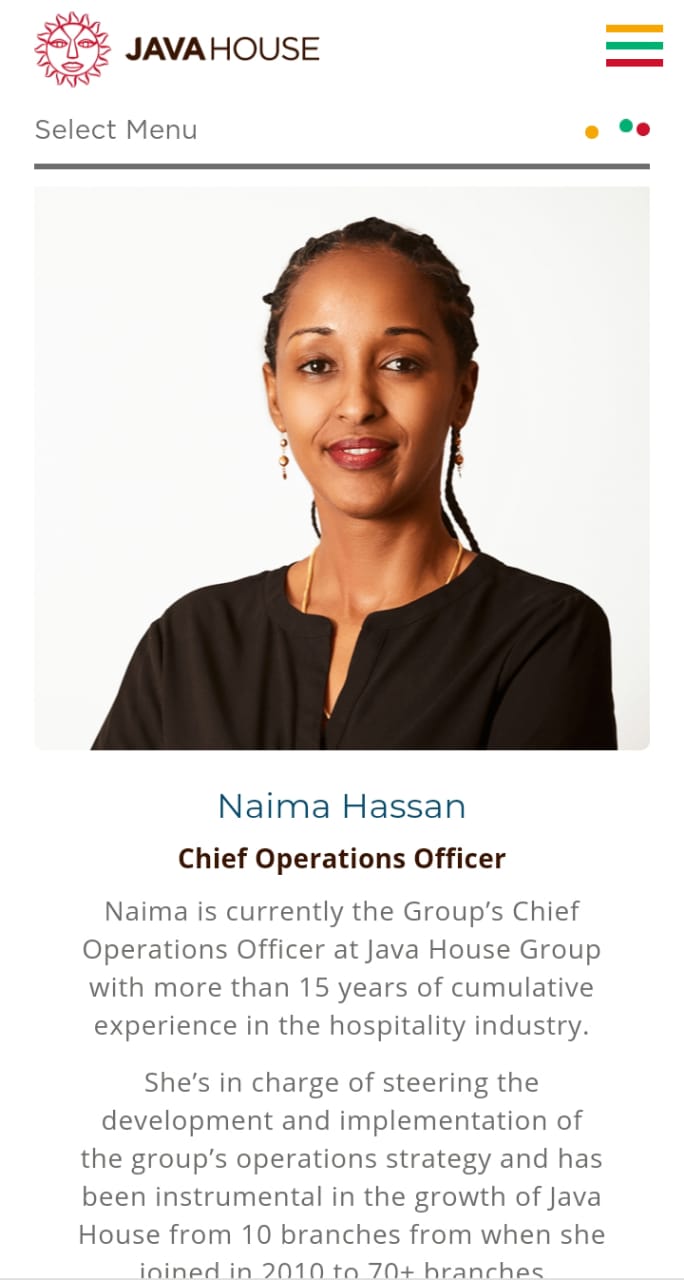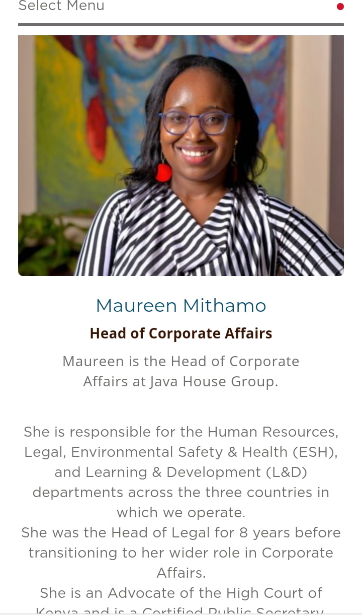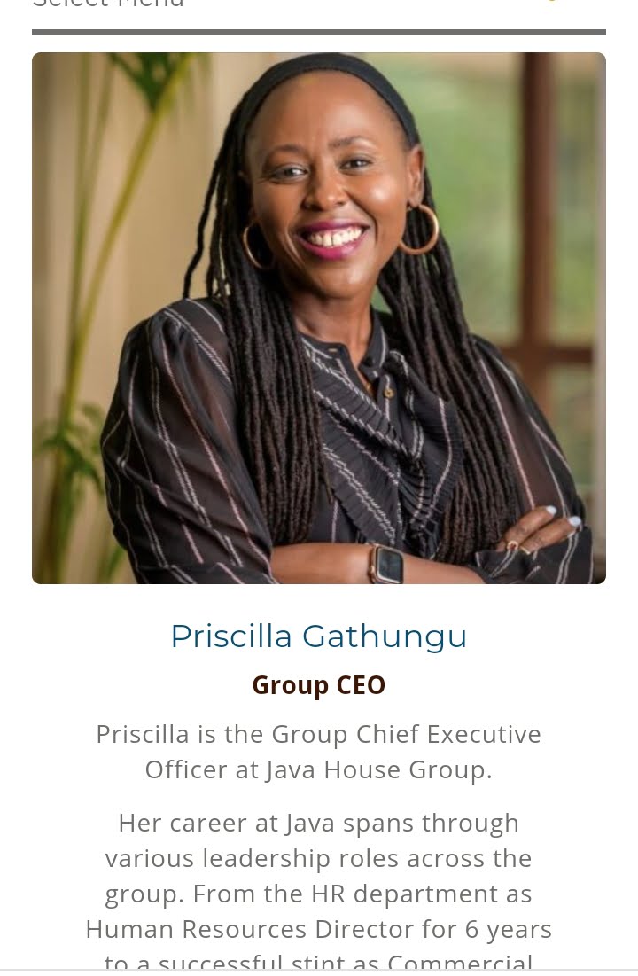 The top management team at Java House is made up of Maureen Mithamo, who serves as Head of Corporate Affairs, Naima Hassan as Chief Operations Officer and the Group CEO Priscilla Gathungu.