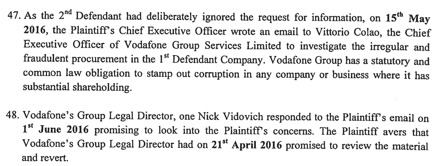 CAPTION: Vodafone, Safaricom's influential shareholder is contacted but responds in a peculiar manner (See item 49 below in bold)Collymore having been caught off guard, it is the crooks around Sylvia Mulinge that advised the now panicky Vodafone conglomerate to file an injunction at Milimani Law courts. Item 49, ‘The 1st Defendant (Safaricom Plc) and Vodafone Group Services Limited responded to the request for information and answers by filing a suit at the Milimani Commercial and Admiralty Division in HCCC No. 228 of 2016 seeking to gag the Plaintiff purportedly on grounds of publication of injurious falsehoods. An application for interim orders of injunction was dismissed in a ruling delivered on 4th October 2016’. They lost, and Transcend was about to unleash, to the public, one of the biggest scandals in the history of corporate Kenya. Safaricom moved with speed to quell the issue by agreeing to compensate Transcend for its intellectual property. Vodafone Group Services was left with an egg on the face. Sylvia had lied to Vodafone that everything was gonna be alright and that they'll handle the issue. But the manner of its handling went against ethical business practice. How Vodafone still keeps Mulinge at the top of the firm is not a mystery. You've seen her work. The continued infringement of intellectual property rights by Safaricom continues, the evidence aptly captured here and elsewhere. The document was to be hidden but the truth on the infringement of intellectual property has come out, thanks to nyakundireport.com.