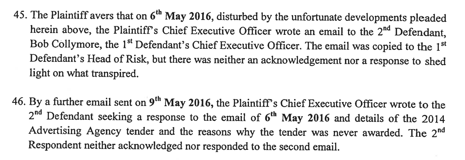In the Transcend Saga, Bob Collymore is confronted by the directors of that firm through two emails. The contents of the emails requested him to shed more light on Transcend’s submitted proposal in the tender titled, Request for Proposal (RFP) for 2nd Agency for Safaricom ATL/BTL Creative and Digital Services on 25th January 2016, which had been stolen and given to Saracen Media Limited to implement. Transcend had copyrighted its proposal and submitted it as, Kenya Speaks Safaricom, Youth Assets Communication Strategy, Digital Tribe and Shangwe Sato along with the peculiar artistry, concept and modifications. Safaricom was looking for a company that would create and implement a communication strategy that touches on the youths.