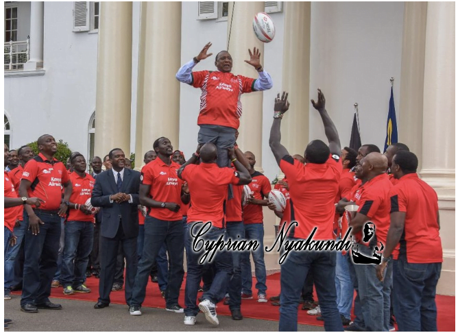 President Uhuru Kenyatta is lifted by Kenya 7s team members when they paid him a courtesy call at State House. This is now a but a fading memory after the misbehaviour by players and coaches. Uhuru wants them as far as possible from him, probably until they win another tournament!