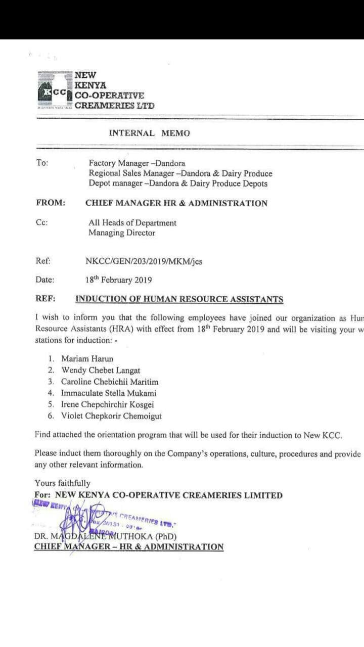 The letter dated 18th February, 2019, and signed by the Chief Manager HR & administration Dr. Magdalene Muthoka, appoints 6 human resource assistants from two tribes i.e. Kalenjins and Kikuyus.