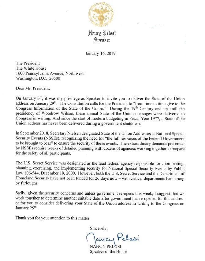 The letter was the first response from the White House, which had stayed uncharacteristically silent after being caught off guard Wednesday by Ms. Pelosi’s threat to reschedule the Jan. 29 State of the Union address in light of the partial government shutdown.
