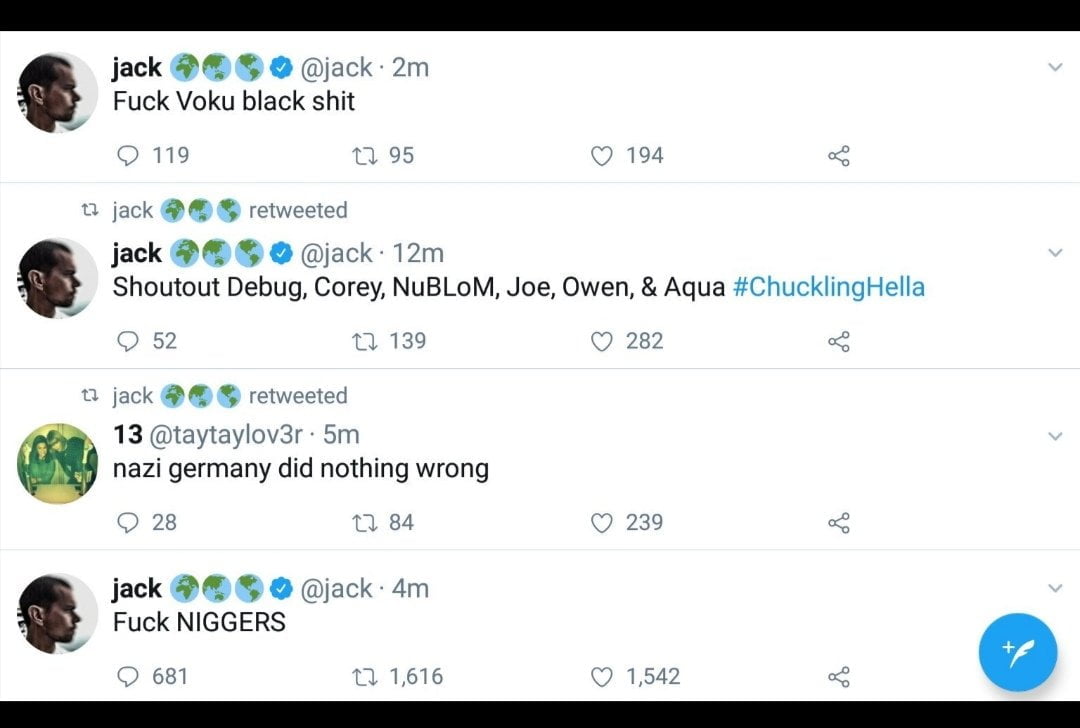 Jack Dorsey, co-founder and CEO of Twitter Yesterday, the owner of the earth Twitter CEO Jack Dorsey's account was hacked. Hackers went on to post racial epithets, profanities and bomb threats on Friday afternoon. Twitter banned Cyprian Nyakundi from the platform on flimsy grounds. Nyakundi style of tweeting never c