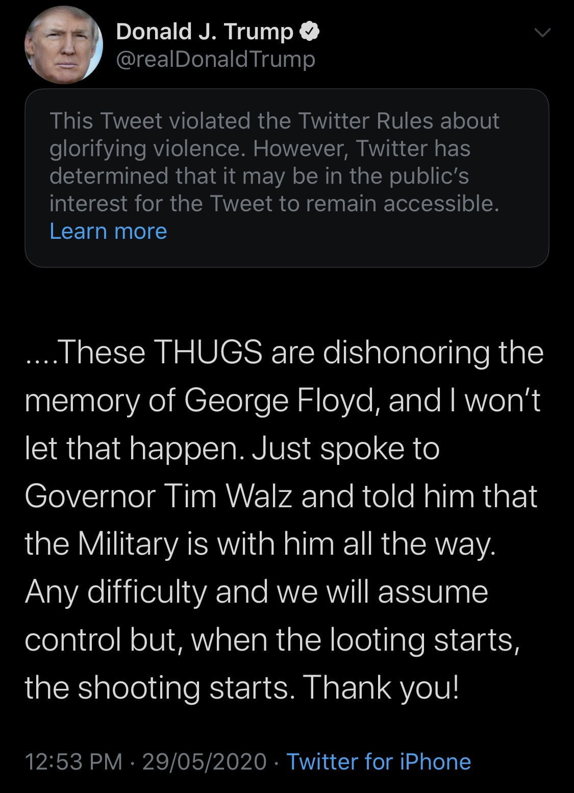 Donald Trump tweeted “When the looting starts, the shooting starts,” while threatening to send in troops to have Minneapolis protesters shot.