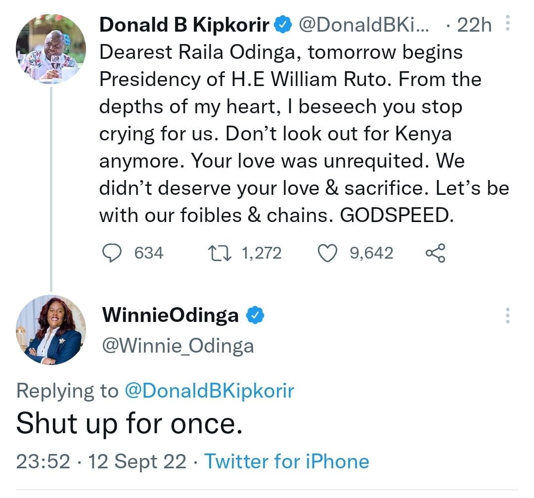 In a series of tweets (some of which were later deleted) published on Monday, September 12, the eve of the swearing-in of William Ruto, Kenya’s fifth president, Winnie launched scathing attacks on self-imagined “enemies” of her father, who is still nursing the pains of losing the recently concluded presidential election.