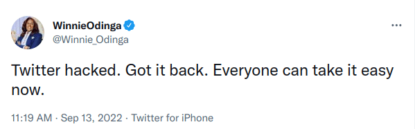 Hours after she went on an embarrassing online rampage, Azimio Leader Raila Odinga’s last-born daughter Winnie Odinga now claims that her verified Twitter account was hacked.