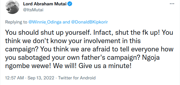 “You think we don’t know your involvement in this campaign? Do you think we are afraid to tell everyone how you sabotaged your own father’s campaign? We will! Give us a minute,” Digital Media Consultant Abraham Mutai lashed back.