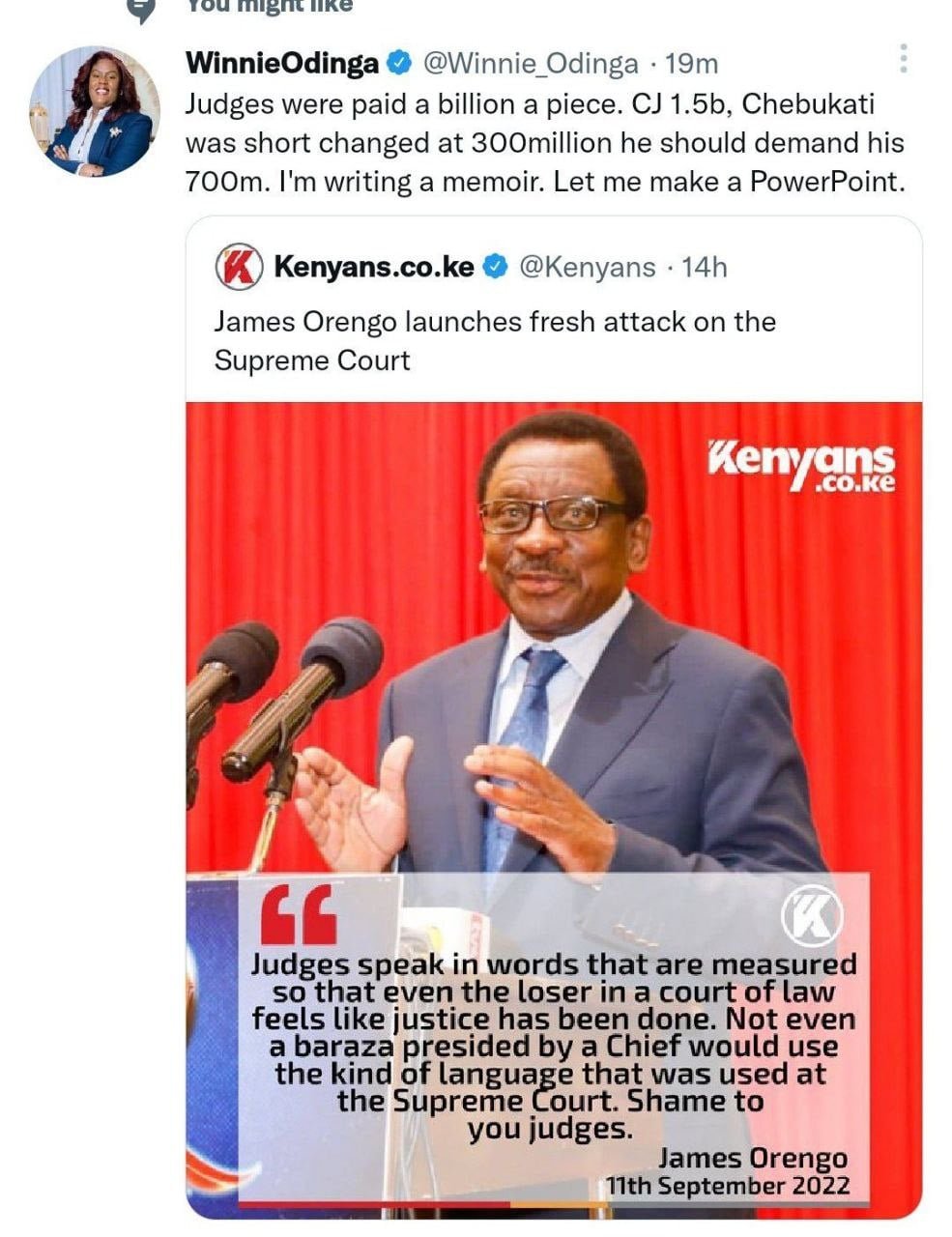 “Judges were paid a billion a piece, CJ 1.5b, Chebukati was short-changed at 300 million he should demand his 700m. I’m writing a memoir. Let me make a PowerPoint,” she wrote on the tweet that is now deleted.