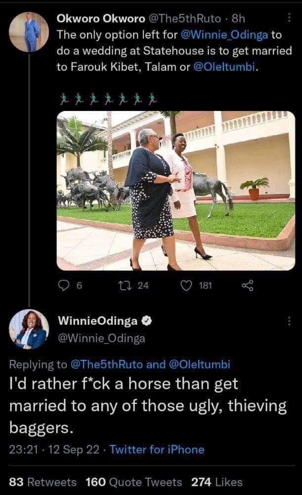 In a different post, Winnie Odinga hurled unprintables at a social media user who had tagged her on a tweet bearing some friendly banter in regards to her now infamous quote of dreaming to get married in State House.