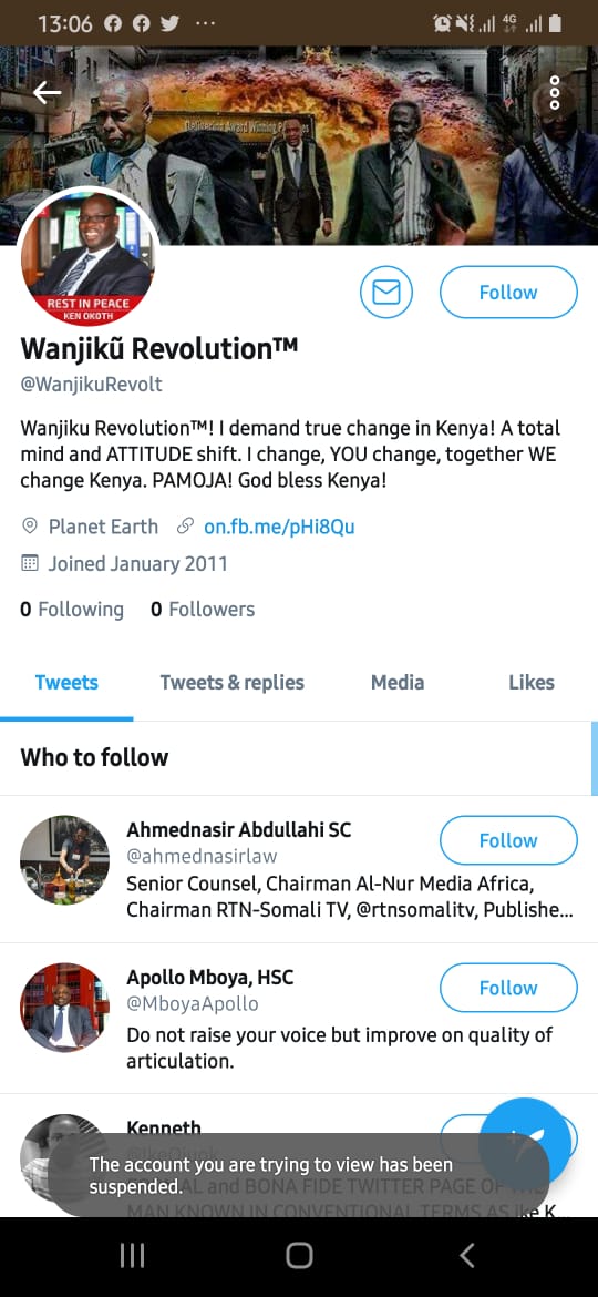 The account Wanjiku Revolt has been suspended over a DMCA report filed by a faceless individual claiming that their content was used in a manner that was not intended.There have been many complaints from social media users alleging censorship and dictatorial policies by the platform that has witnessed a decline in the user-base. Kenya has less than 500,000 active monthly users on Twitter as compared to Facebook that has over 7 Million active monthly users. More to follow