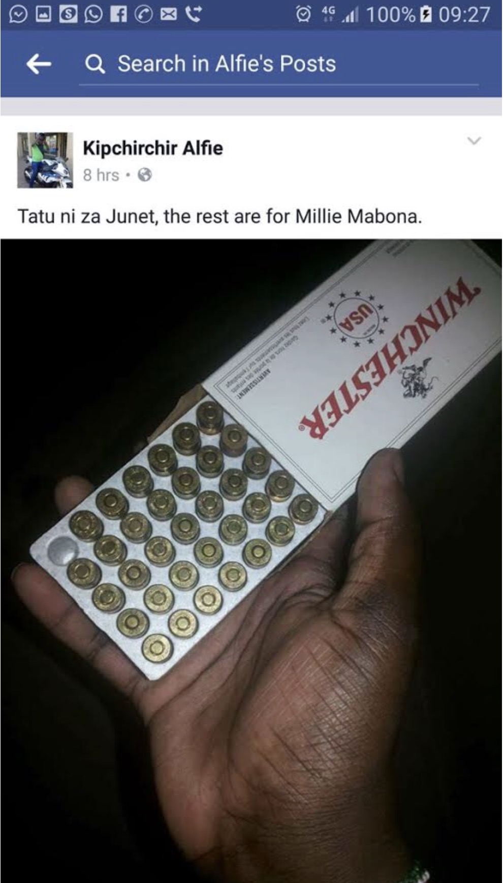 A Presidential Escort officer Kipchirchir Alfie who now works as a instructor at the Kenya Police College Kiganjo, has revealed on his Facebook page, bullets that will be used to assassinate CORD MP's Junet Muhammed and Millie Odhiambo. The sensational revelation was contained in a dramatic Facebook post today morning