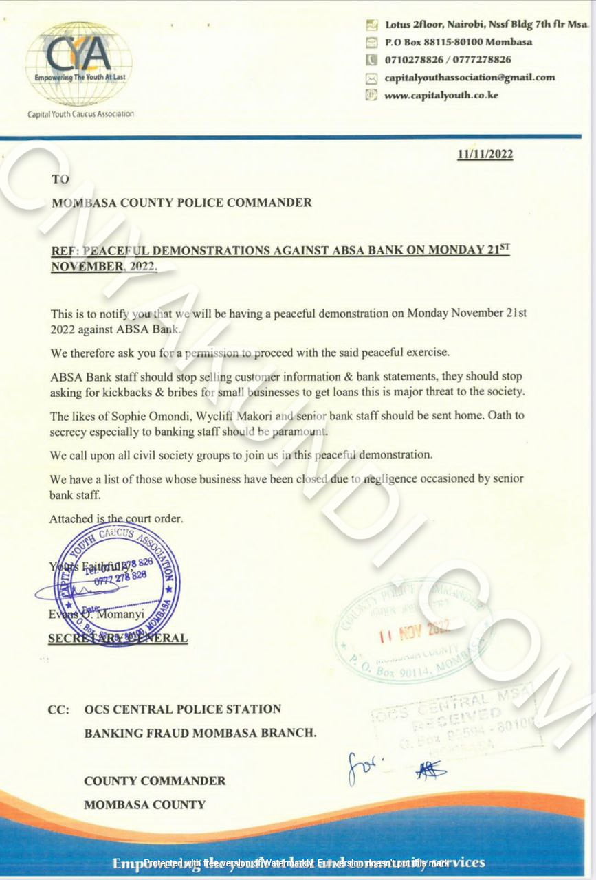 “ABSA Bank should stop selling customer information and bank statements, they should stop asking for kickbacks and bribes from small businesses to get loans,” the letter dated Friday, 11th November 2022, reads in part.