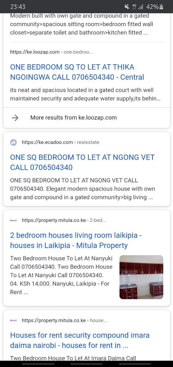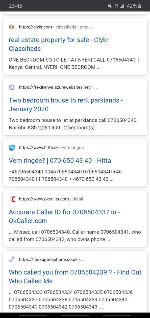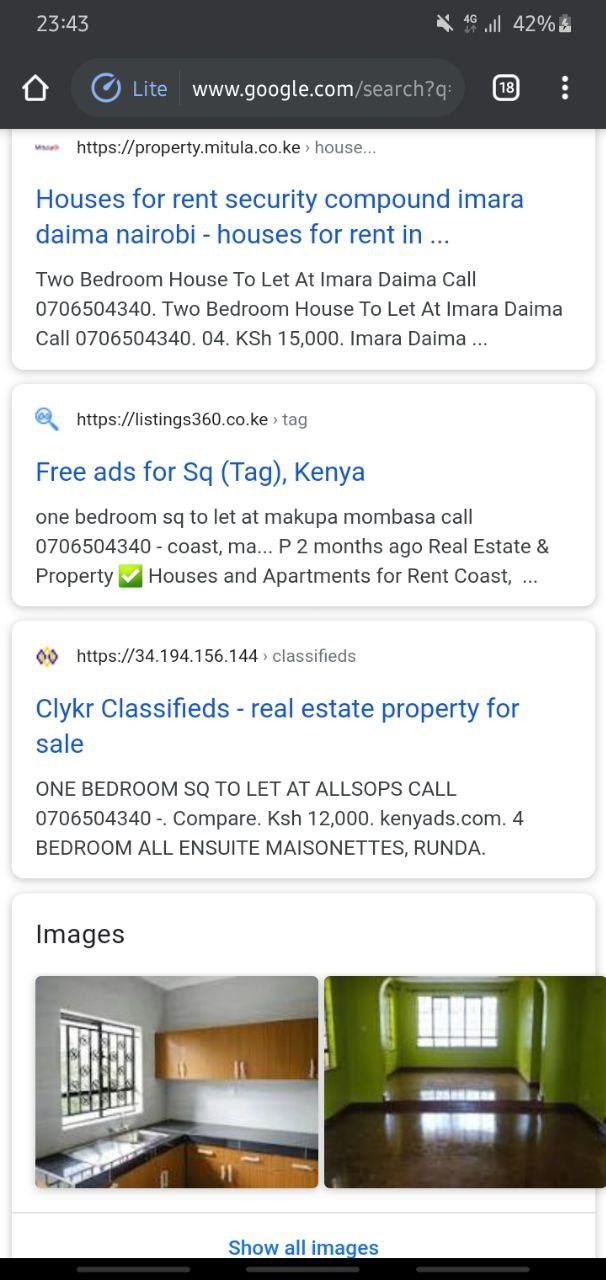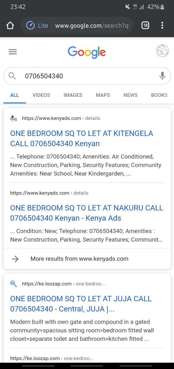 I have attached screenshots of a Google search of the number and an MPESA message. Most of those adverts are the same except for the place. When you call she makes it look like the houses are on such demand that if you don't send the deposit immediately you will not secure the apartment. It would be nice if people knew about this. I was a victim. I'd appreciate if I stayed anonymous.