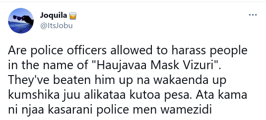 “Are police officers allowed to harass people in the name of “Haujavaa Mask Vizuri”. They’ve beaten him up na wakaenda up kumshika juu alikataa kutoa pesa. Ata kama ni njaa kasarani police men wamezidi,” a tweep named Jobu wrote on the tweet shared to his followers.