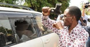 One of the videos shows Uganda Police smashing the window of Bobi Wine’s vehicle.