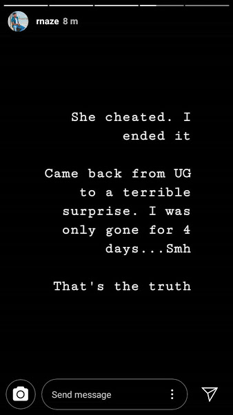 Rnaze accused Natalie of cheating on him when he left for a trip to Uganda.
