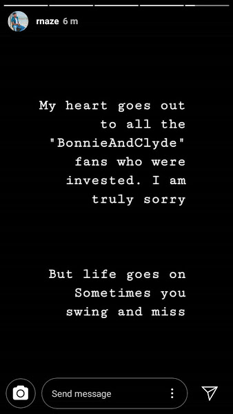 “My heart goes out to all the ‘BonieAndClyde’ fans who were invested. I am truly sorry. But life goes on. Sometimes you swing and miss.”