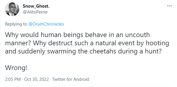 “Why would human beings behave in an uncouth manner? Why destruct such a natural event by hooting and suddenly swarming the cheetahs during a hunt?” another asked.