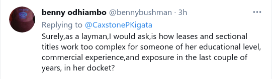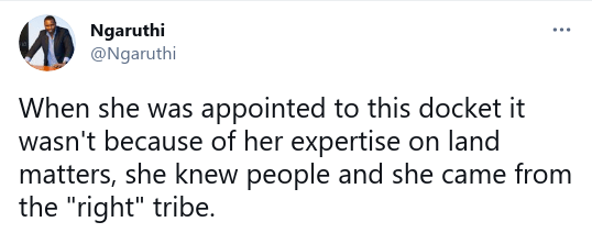 Lands CS is exposing ignorance on technical issues and thus misleading Kenyans. She has no idea how leases and sectional titles work. And she is in charge of the Ministry of Lands. Oooh my God pic.twitter.com/7Tq19DxfB8