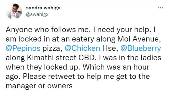 “Anyone who follows me, I need your help. I am locked in at an eatery along Moi Avenue, Pepinos Pizza, at Chicken House along with Kimathi Street CBD. I was in the ladies when they locked up. Which was an hour ago. Please retweet to help me get to the manager or owners,” she wrote in one of her posts.