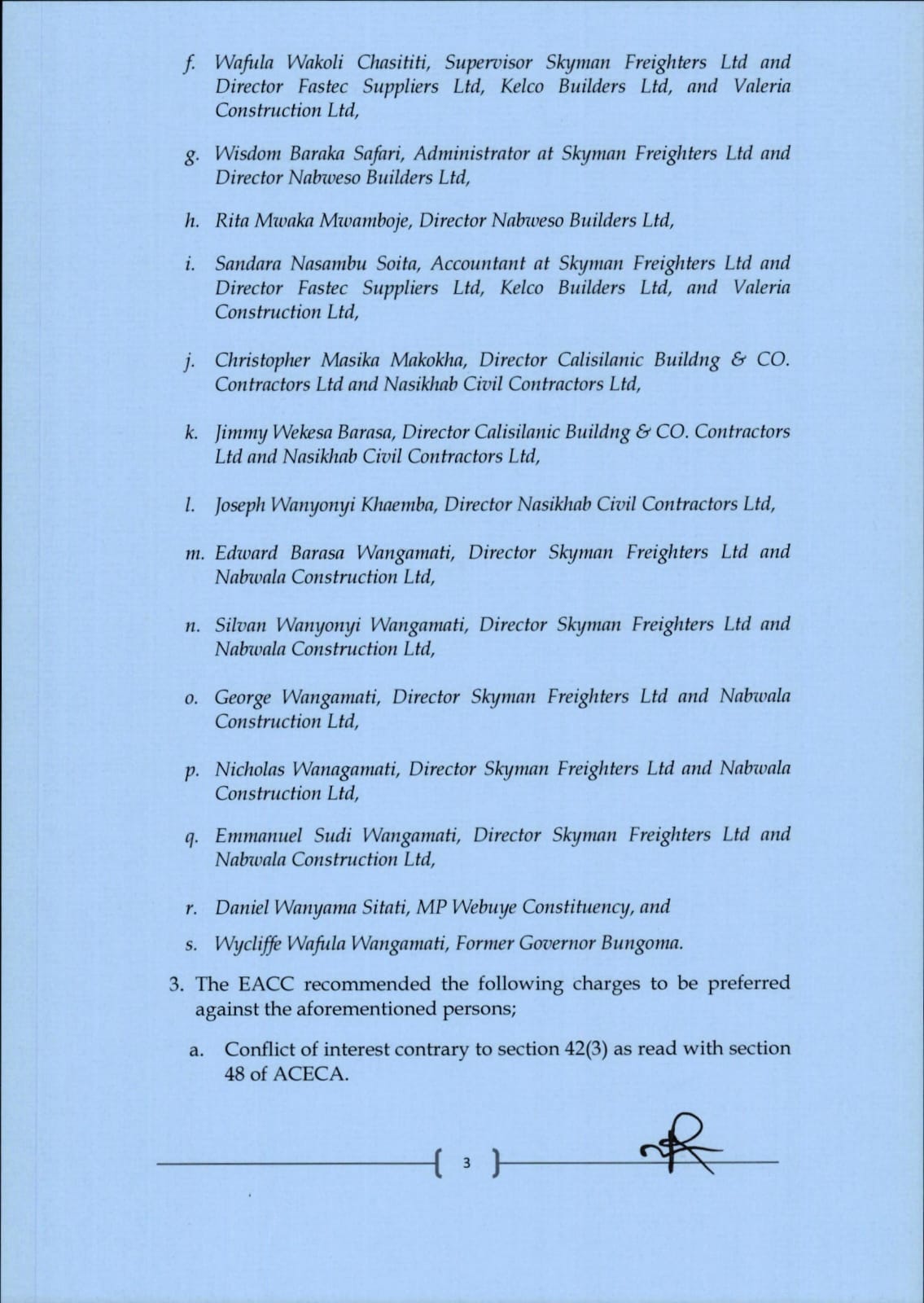 EACC now wants Wycliffe Wangamati, MP Dan Wanyama, and several senior county officials charged with abuse of office, conflict of interest, acquisition of proceeds of crime, and failure to follow procurement laws. Others facing possible prosecution include:- Maurice Marango, chief officer roads and public works.