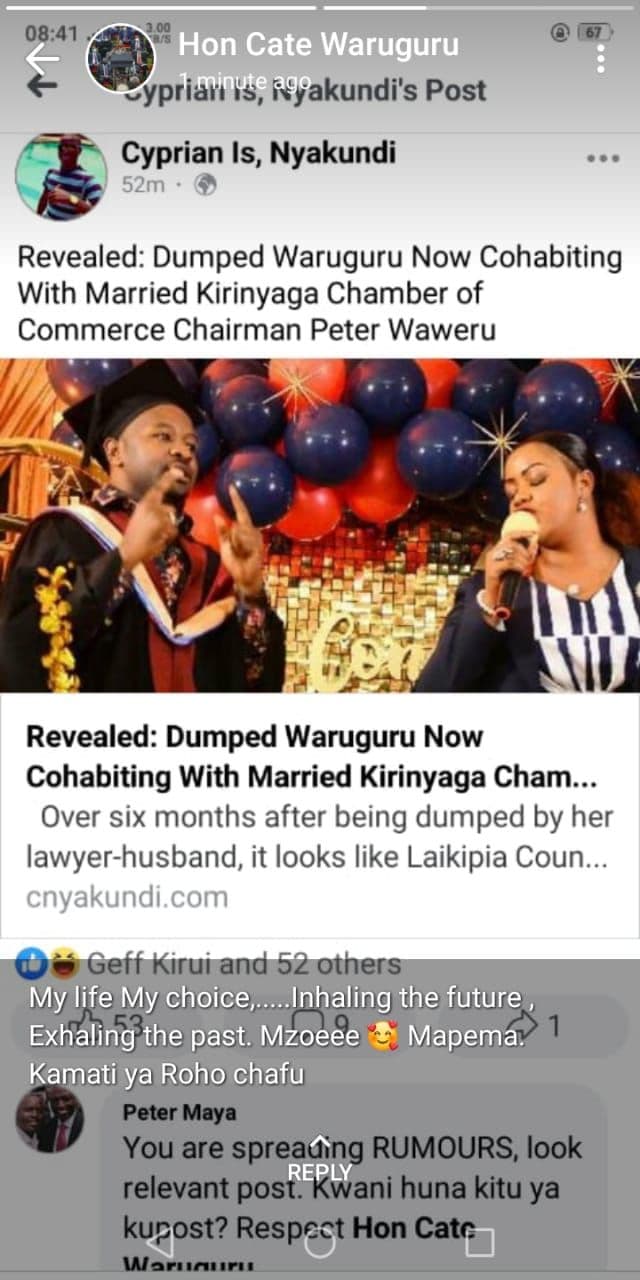 Attached to the status was a screenshot of prolific blogger Cyprian Nyakundi’s Facebook post from earlier in the day, where he had shared with his followers the intriguing story on how Peter Waweru ended up under her wing.