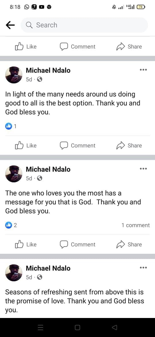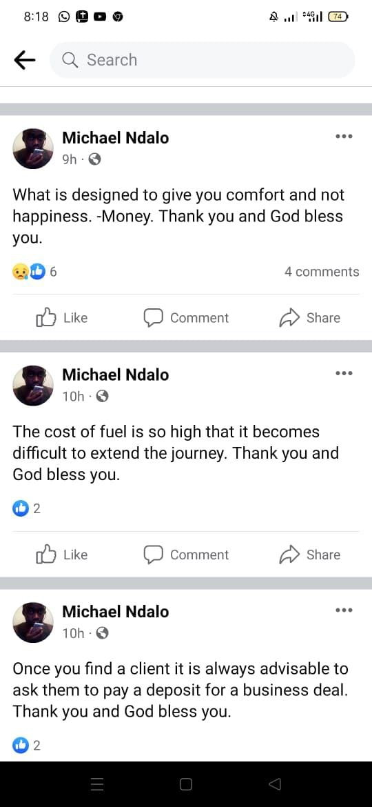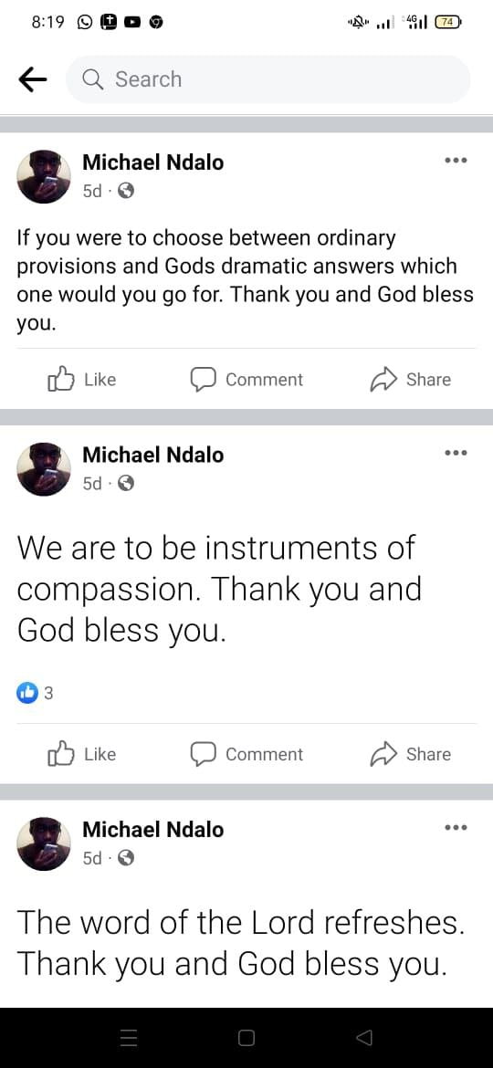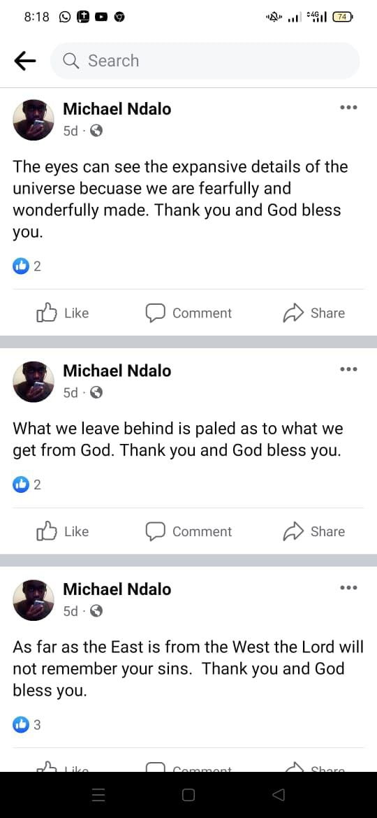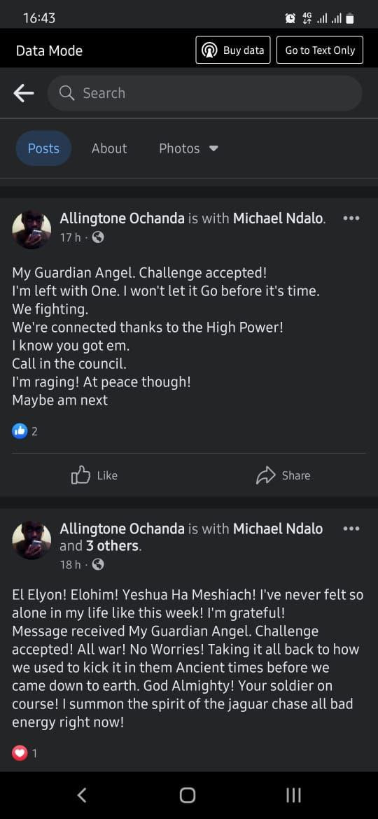 Interestingly, hours before he died, Mr Ndalo had posted a series of cryptic messages on Facebook which paint a disturbing picture of a man that was deeply troubled.