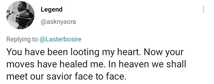 “You have been looting my heart. Now your moves have healed me. In heaven we shall meet our savior face to face,” wrote one tweep.