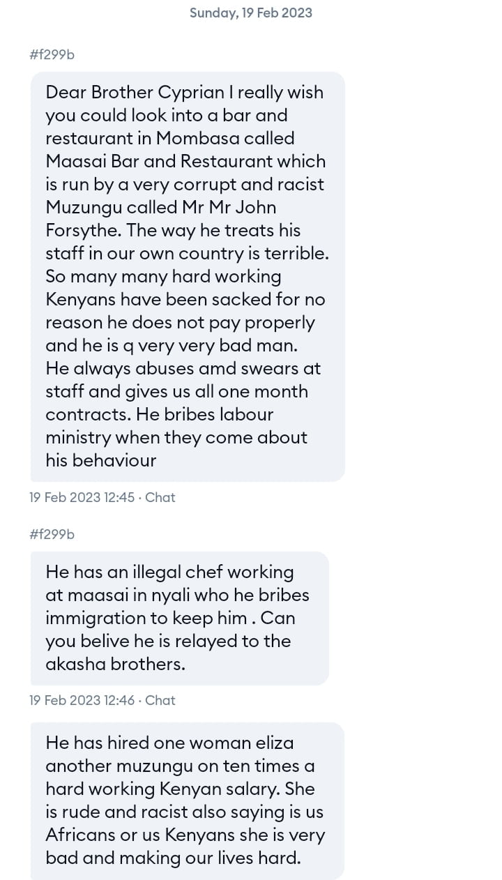 The Maasai Bar and Restaurant in Mombasa owned by Mr. John Forsythe, has come under scrutiny after allegations of mistreating its Kenyan staff.