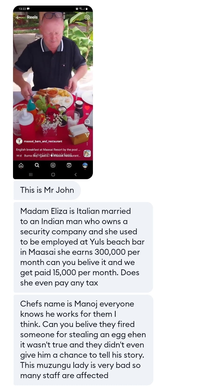 The restaurant's Indian Chef, named Manoj, is reportedly working at the Maasai Hotel in Nyali without proper documents.