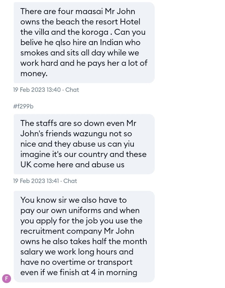 The source also claims that the staff at Maasai Bar and Restaurant are forced to work long hours without overtime or transportation, and must pay for their own uniforms.