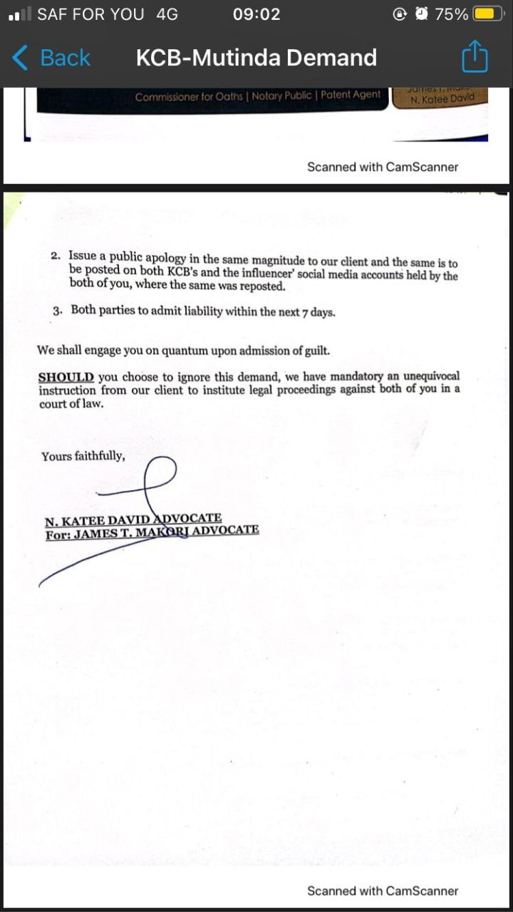 In a demand letter dated 29th June 2022, Wakadinali's lawyer James T Makori Advocate instructed that the videos be immediately pulled down from all social media pages and a public apology issued on the same.