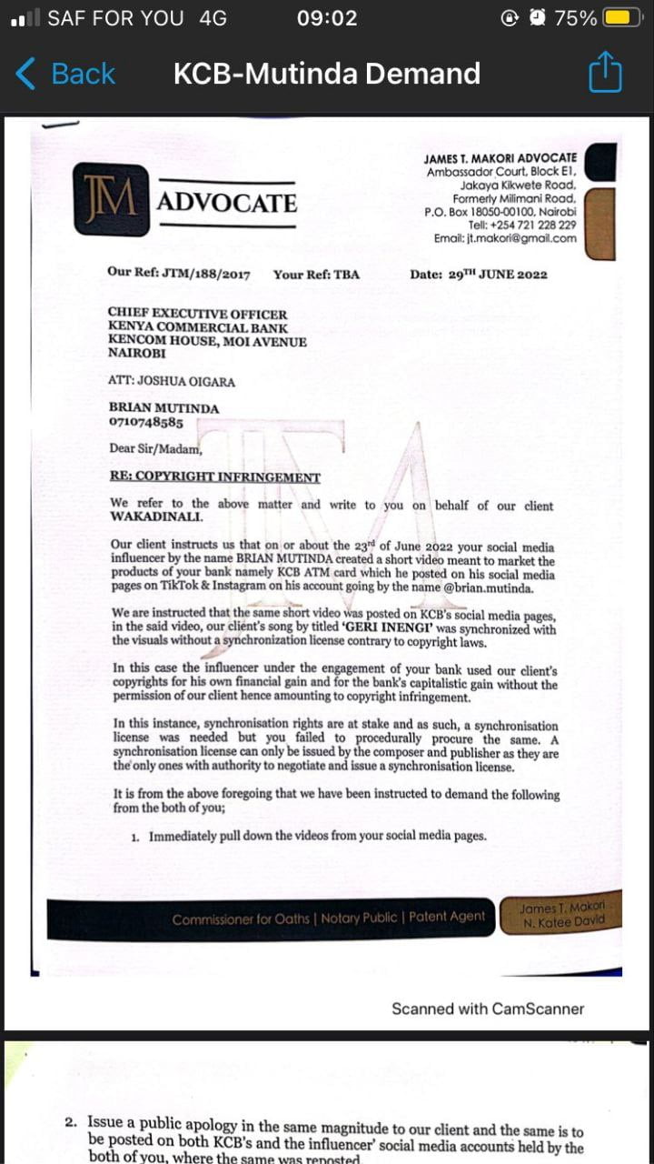 This is after Mr. Mutinda used one of their biggest hits, “Geri Inengi”, for an online advertisement gig commissioned by the Kenya Commercial Bank (KCB) under online marketing agency “Squad Digital” - a subsidiary of WPP-Scangroup.