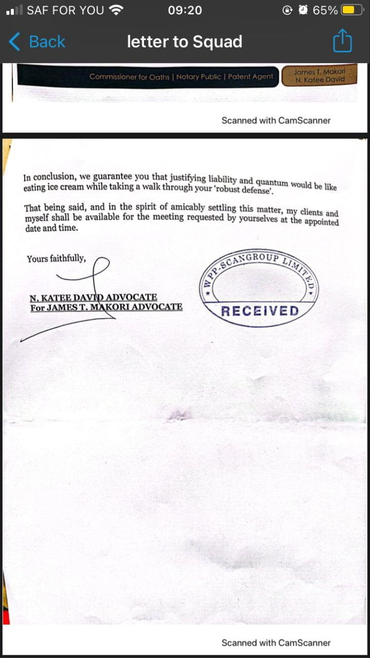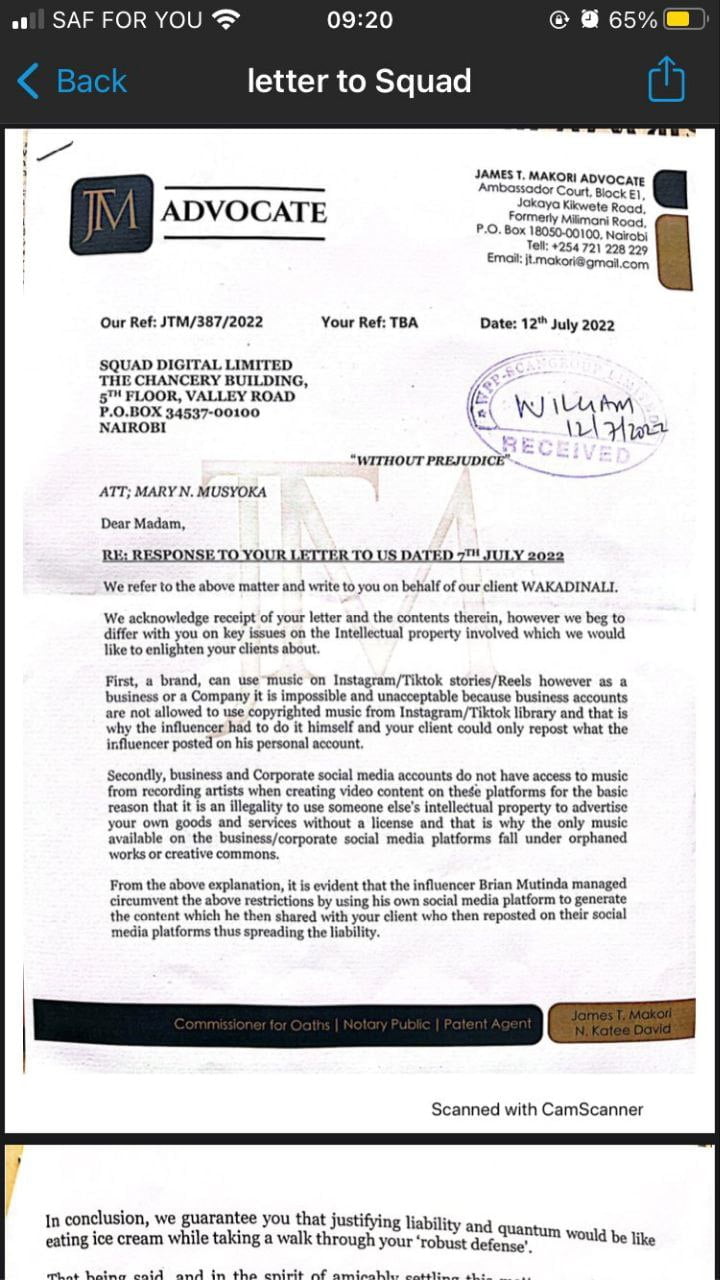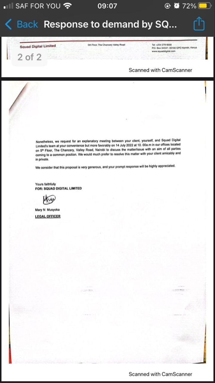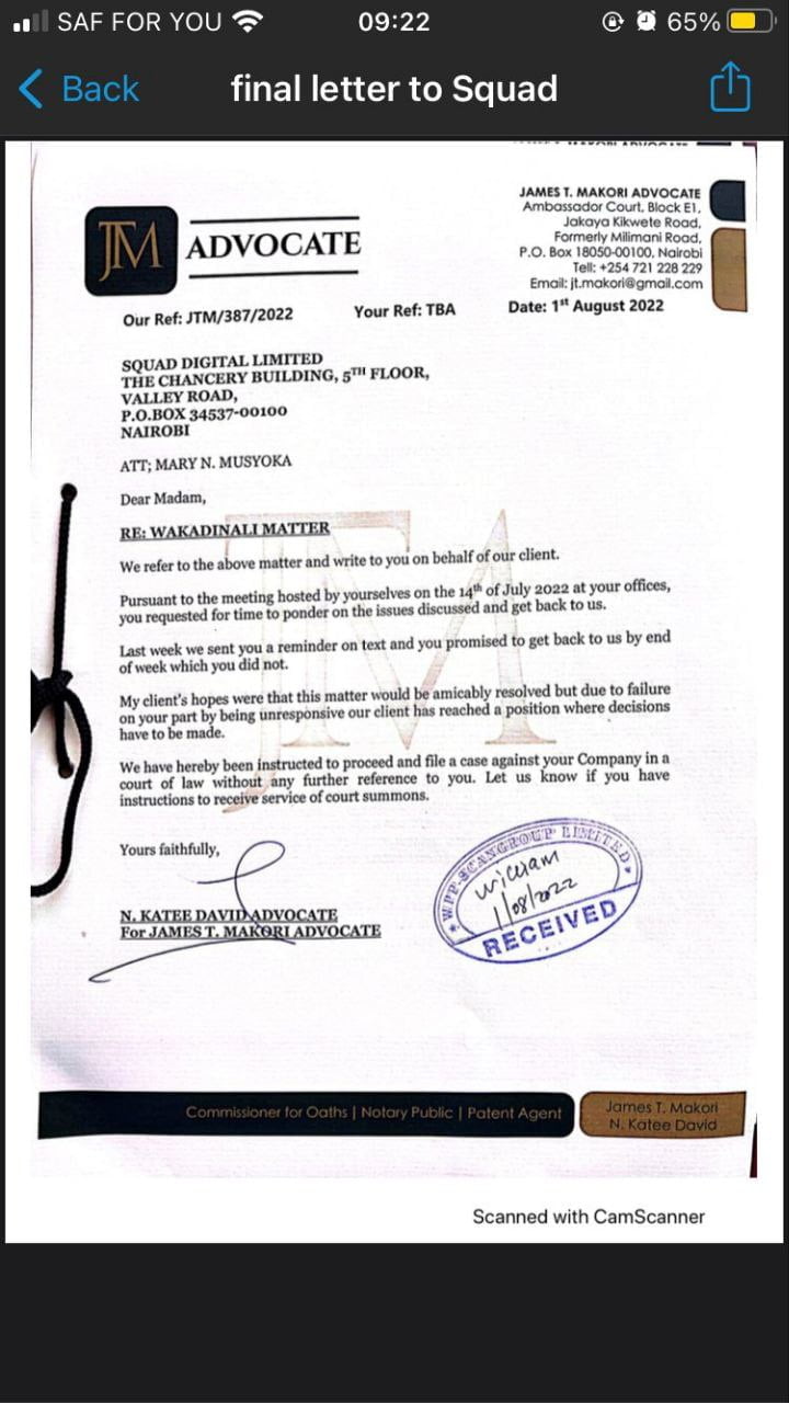 On 1st August 2022, Wakadinali, through James T Makori Advocate, once again wrote to Squad Digital, notifying them that they would be proceeding to file a case against the company in court.