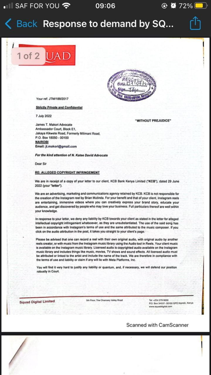 In their response, Squad Digital denied any liability by KCB towards Wakadinali as stated in the letter for alleged intellectual copyright infringement, arguing that their music is available on the Instagram music library.